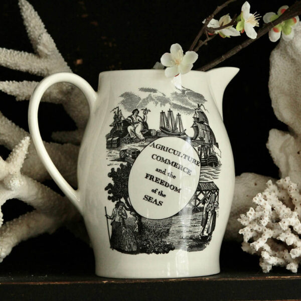 Its graphic nature. Oh how I love everything about this fantastic porcelain pitcher manufactured by Wedgewood in England. The black graphics are amazing, and the back has a population count of the 16 original states. Perfect for displaying with a coral collection, or showcasing a bunch of pink peonies in the spring!