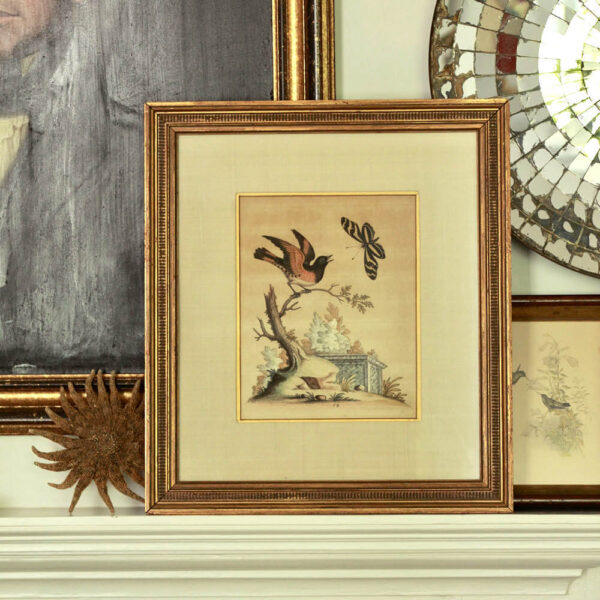Classic beauty. I found this stunning 18th c. engraving by George Edwards in South Carolina. The subjects: American Redstart, Butterfly and botanical are just so beautifully rendered and charming! This piece was professionally framed by Coffey & Thompson, North Carolina and is double matted in a silk mat with a gold filet and classic wood frame finished in an antique gold. A rare find.