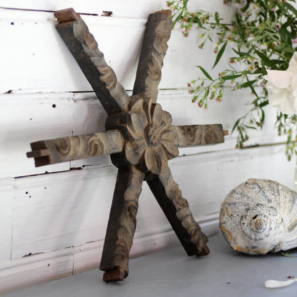 So unique. This hand carved fragment caught my attention. I love its unique shape. It may have been the workings of an antique wheel? Its star shaped silhouette stands out, as well as its intricate hand carving. Style it as a leaner, or top off a stack of large coffee table books.