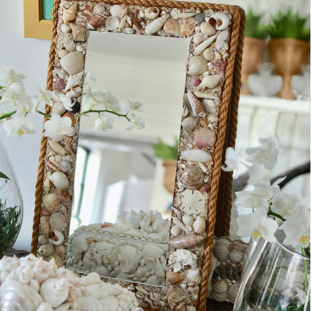 Shells, rope, mirror, wood board back, wired and ready to hang