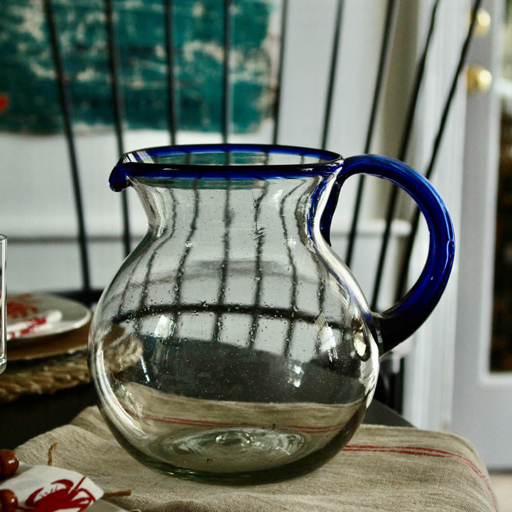 To have and to hold. This beautiful hand blown pitcher is quite robust with its shape and weight. The glass has tiny bubbles and is complete with a rich blue collar and handle. Perfect for serving your favorite beverage or filling with a freshly cut bunch of flowers!