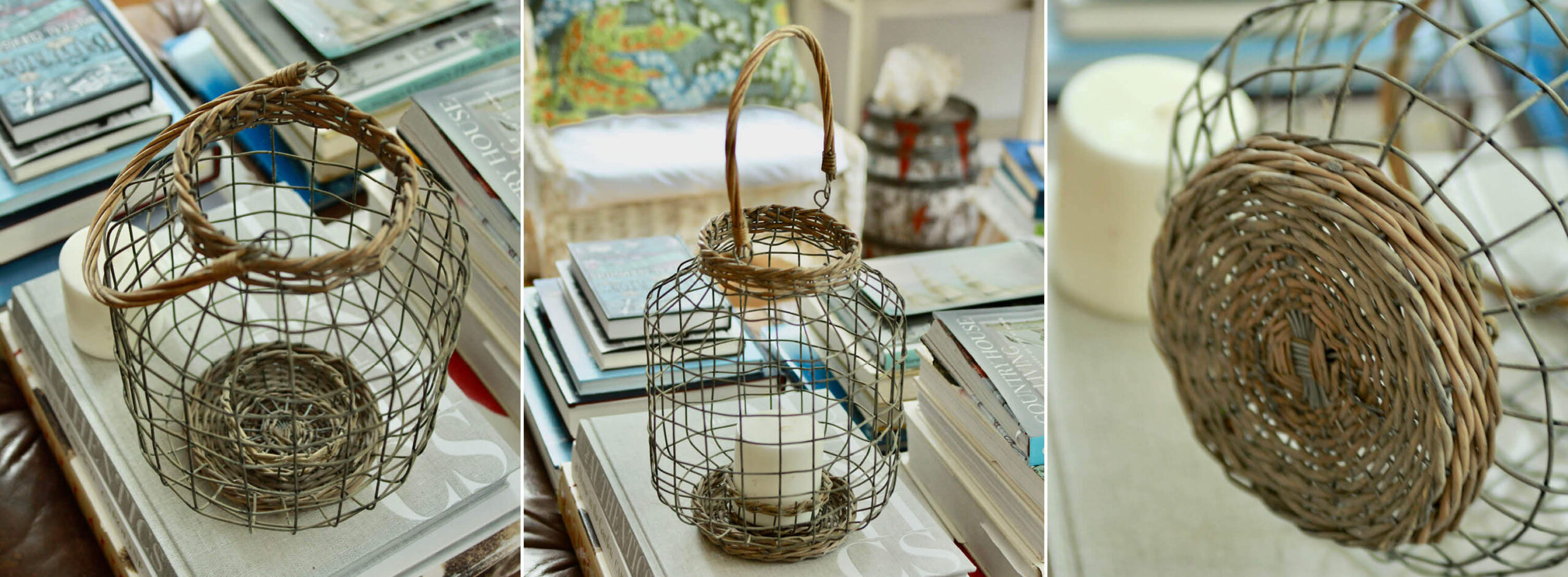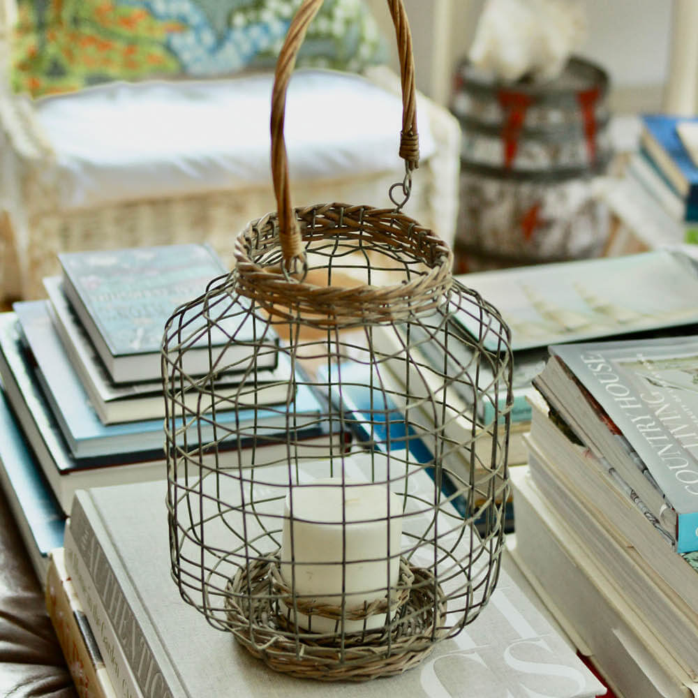 Indoor and outdoor chic. I love the generous scale and form of this hurricane. Handcrafted of wire and made quite sturdy with a weathered wicker base (that holds a pillar candle up to 3”W) and a weathered wicker collar. The twisted wicker handle is hinged on a pair of metal loops. Such a summertime staple!