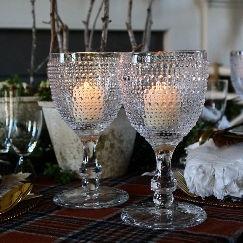 Statement makers. I love the generous scale and weight of this pair of pressed glass goblets! I’m showing them here as votive holders, but they would also make fabulous water or wine glasses! Their textured dotted bowls are just so beautiful!