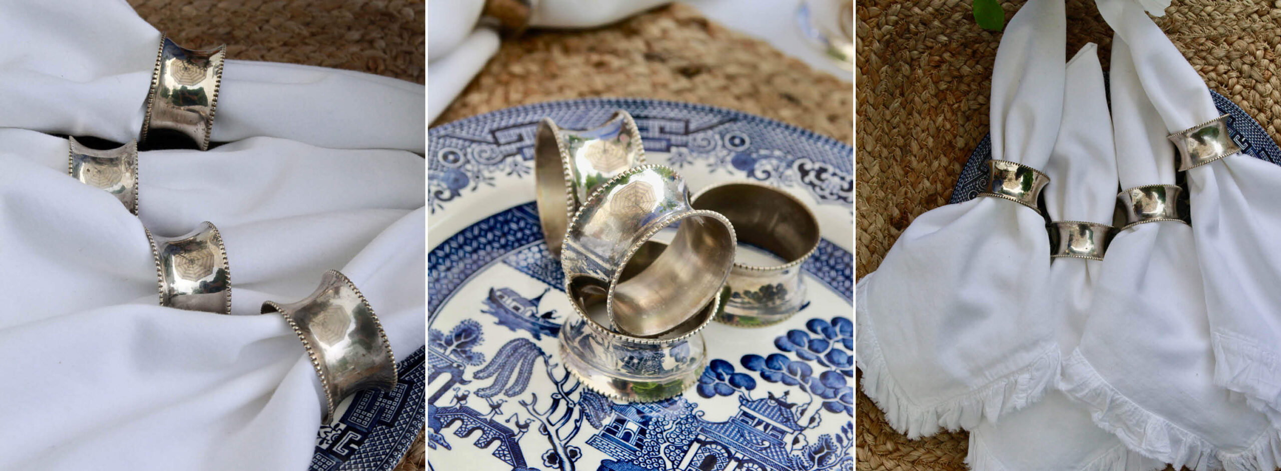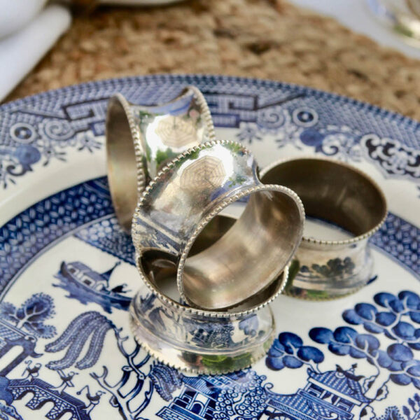 Timeless. This set of four silver plated napkin rings are a true classic. Their shapely form help to effortlessly hold a cloth napkin in place, and their beaded rims add just the right touch of fine detail.