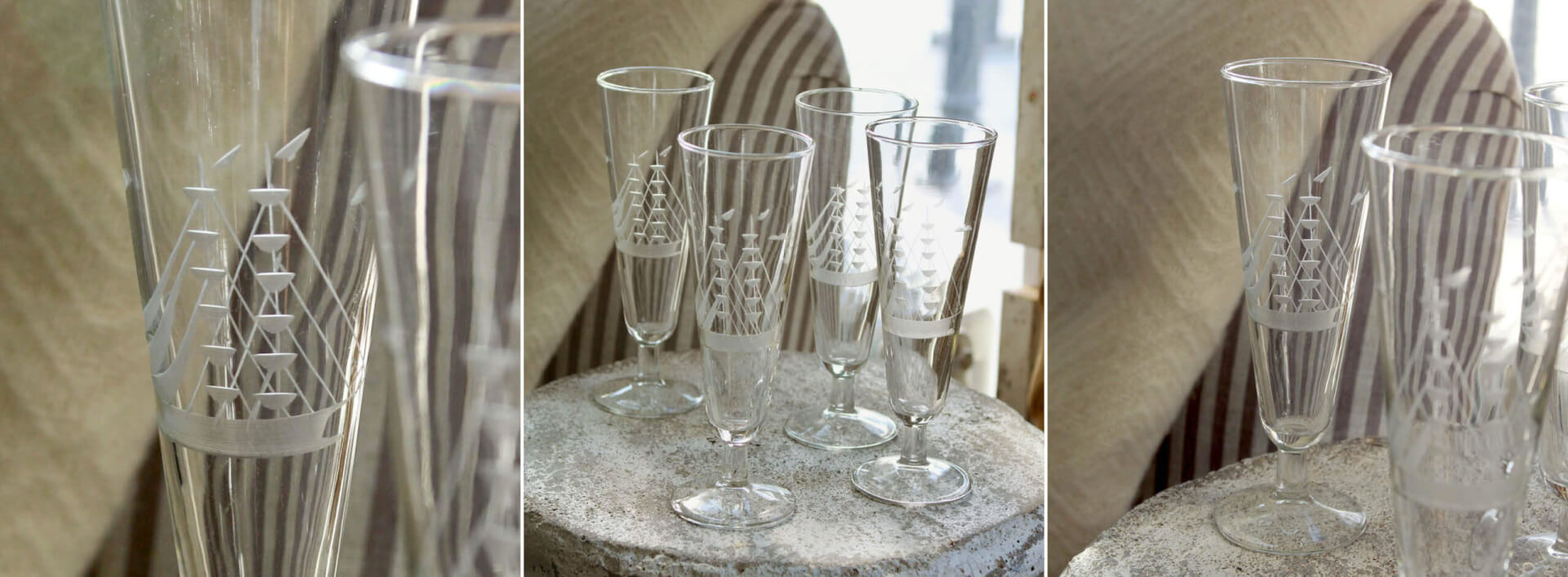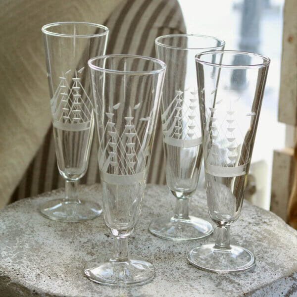 Nautical spirit. I love the motif of clipper ships etched into clear glass. Here we have a set of 4 that are perfect for chilled beer! Cheers!