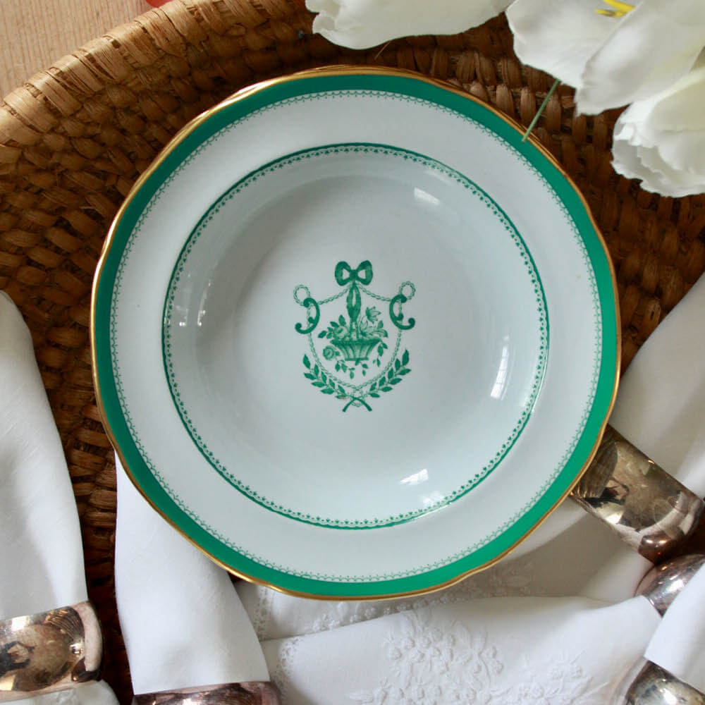 Understated elegance. This set of 8 Copeland Spode ‘Newburyport’ soup bowls are made of fine English stoneware. I love the historical 1780 pattern design of rich bands of Emerald Green with a string of tiny belle flowers, an Armorial style crest as the central medallion which is a flower basket with bows and wreaths of laurel. And of course the gilded rims make them just so perfect.