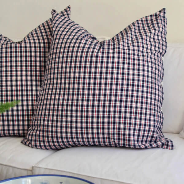 Statement maker. This navy, red and white miniature plaid cotton is the scale of a Euro Sham and is enclosed with 3 petite buttons. It is stuffed with a large feather down pillow insert. Perfect for a bed or sofa.