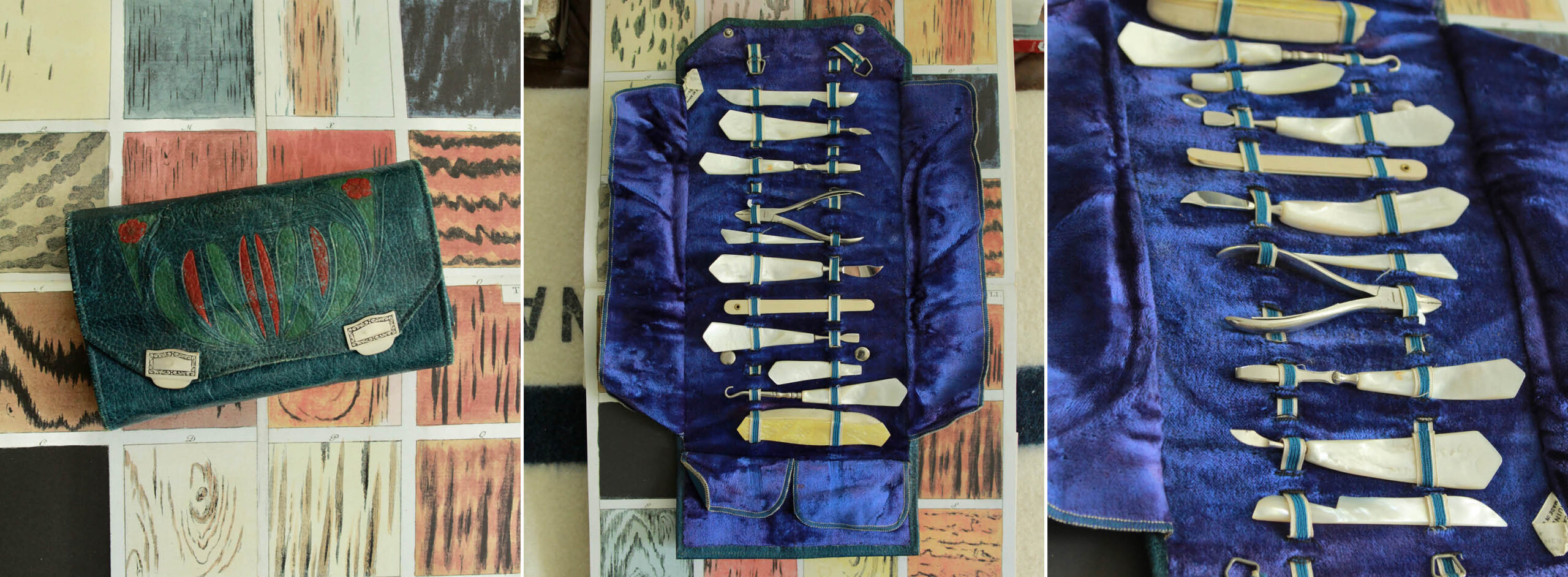 Stainless steel, Mother of Pearl, Bakelite, Chamois, leather, velvet, metal snap enclosures, elastic