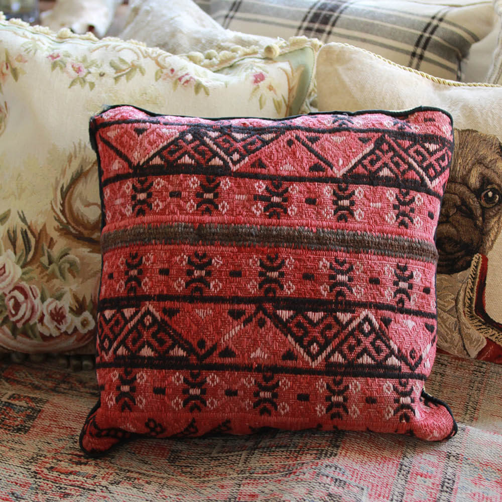 Add a pop of color. This antique Turkish pillow is wool and hand loomed in a striking color combo of a deep Nantucket Red, Charcoal, and a touch of Cocoa. It has an old gold cotton/linen back with a hidden zipper, a thin black cotton welt, and a feather down insert.