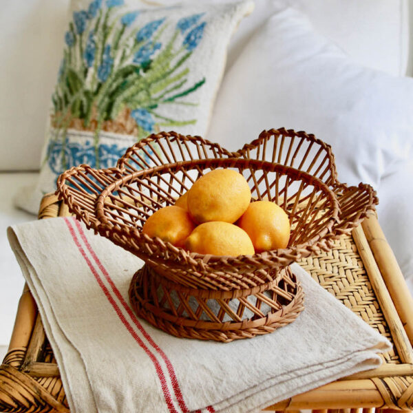 Happy, happy! I am addicted to baskets….good ones! And this little beauty has so much interest with its graceful, scalloped form and variety of design in its open weave. Perfect for holding fruit, or add a pretty linen napkin for serving bread.