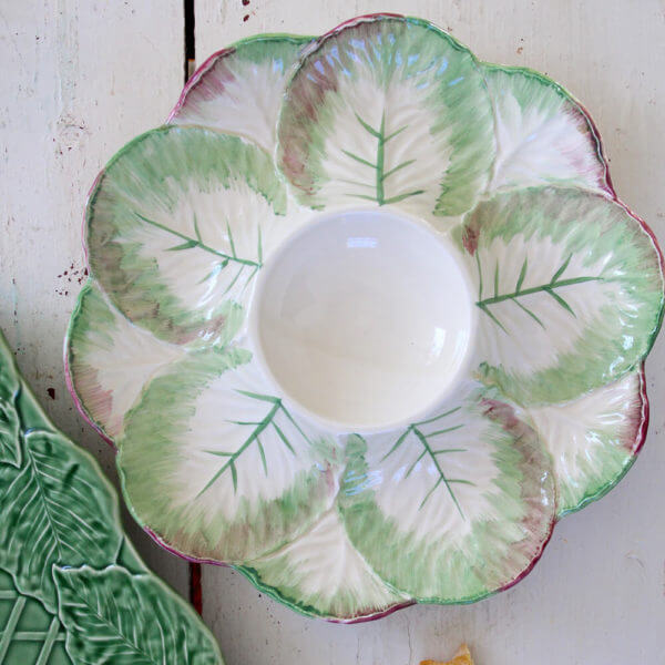 Serve in pretty garden style! I am in love with European pottery that comes in the form of vegetables and fruit! These kinds of serving pieces add so much interest to a table. This one is especially charming as a sweetly scaled creamware serving piece deftly hand painted and shaped in the form of an open ornamental cabbage! A raised bowl in the center is perfect for dips, while the “leaves” are just right for cut veggies, crackers, or chips.