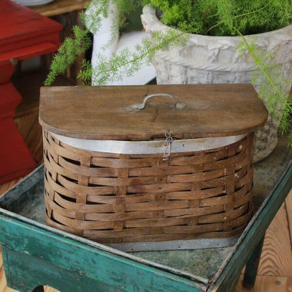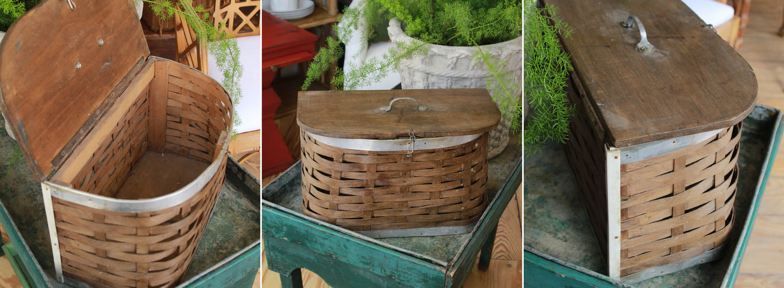 So unique. This French Basket is truly a one of a kind! Woven of splint, and reinforced with metal edging, it sports a wood lid with handle that hinges open to reveal a roomy interior that is braced with a piece of wood and old L-bracket! The base is wood as well. Just never seen one like this! Love.