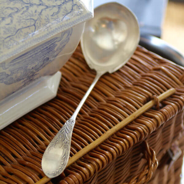 Graceful & pretty. This lovely ladle is so graceful in form with floral motifs on both sides of its handle and at the neck of its bowl. The silverplate finish has some wear on the underside of the bowl. What a beautiful addition to a punch bowl and soup tureen!