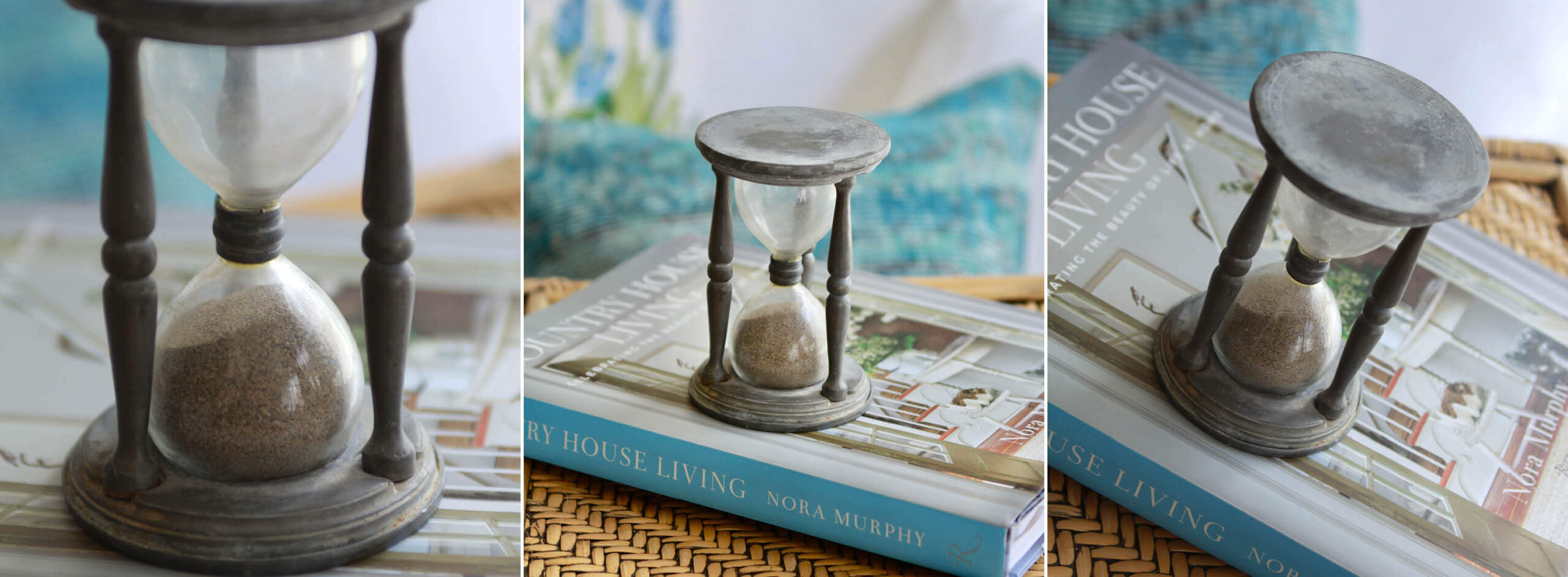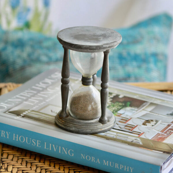 Classic ingredients. What a wonderfully unique vintage piece to have on a desk or hold down a stack of papers or books…and what a cool timer for a game of Scrabble! The old brass is oxidized to a lovely patina, and the glass hour glass still holds its original sand.