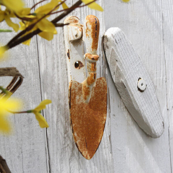 A fresh take on a classic. Front door, side door, back door, garden shed door, any door you hang this wonderful white washed, rusty beauty will hint that a gardener lives here. Crafted of iron, this miniature hand trowel is so classic in form, and gives off a clear “clacking” sound when used.