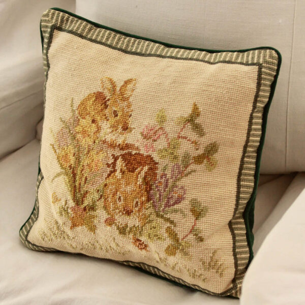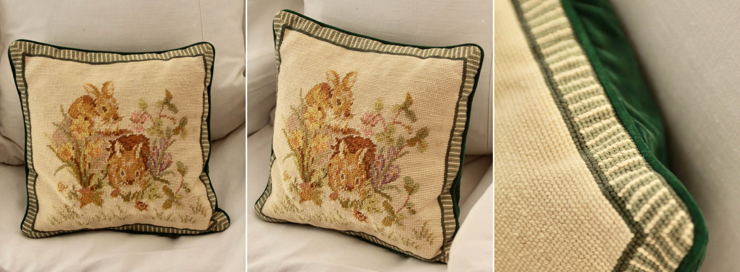 Wool needlepoint, cotton velvet back w/zipper, feather/down insert