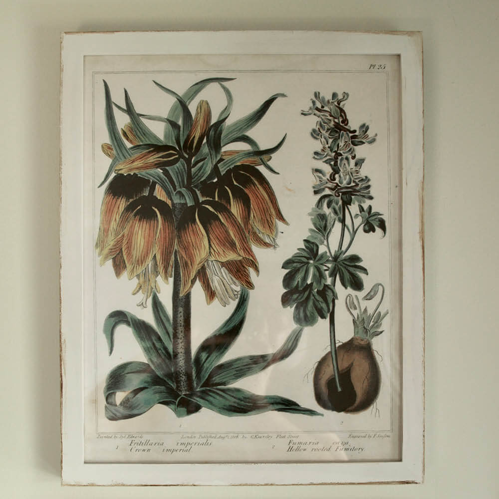Garden notes. A wall grouping is an effective way to “get a collected look”. We’ve chosen 4 charming John Derian’s garden-themed prints and dressed them simply in lightly hand distressed frames. This ‘Fritillaria’ print works beautifully in a grouping or all by itself.