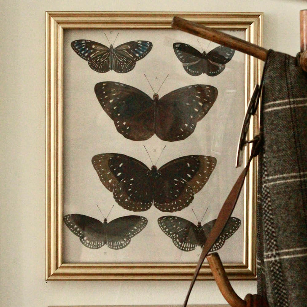 Great for layering. This beautifully framed John Derian butterfly print features richly detailed natural history illustrations in the style of 18th and 19th century scientific plates. The composition displays multiple hand-colored butterfly specimens, evoking classic European entomology engravings. Presented in a simple gold tone frame that complements its warm paper tone. A great piece to start a gallery wall with.