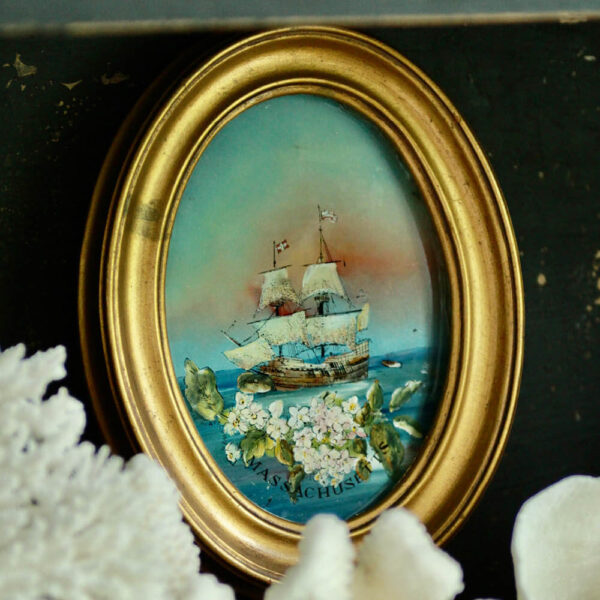 A rare find. One of my favorite antiques collectors and pickers is my friend John Mudry. He always surprises me with the most unique antique finds…and this one is no exception! This reverse glass painting features a hand painted clipper ship, flowering branches, and ‘Massachusetts’, and is housed in a painted gold wood frame with a sawtooth hanger on back. The back is not covered so you can see the actual paint!