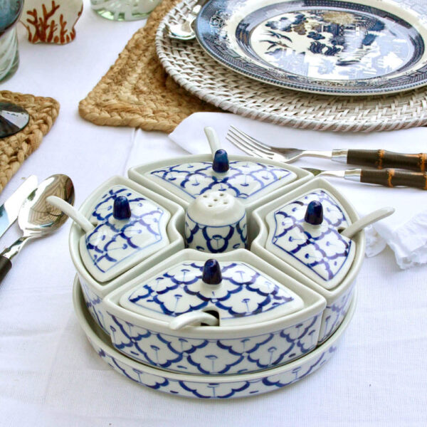 So practical and oh so stylish! What a fabulous serving piece that is so compact, organized, and easy to self serve from. Four demilune porcelain bowls with lids are complete with petite porcelain spoons, a salt shaker in the center – and all removable from its round tray. So easy to fill, serve, and clean!