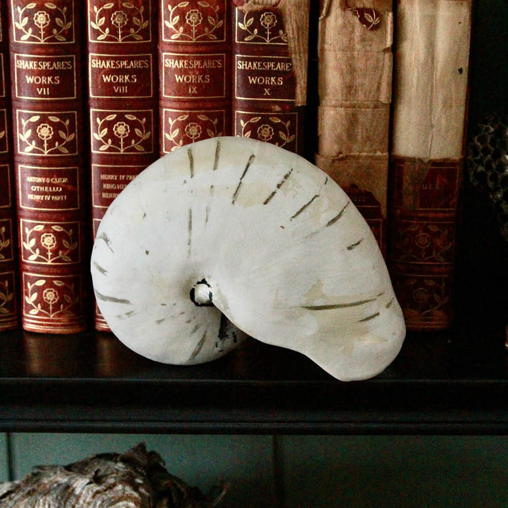 Quiet texture and architectural form. This striking natural nautilus shell with a beautifully balanced spiral form and soft white surface marked by worn striations is a stunning sculptural piece. It has a distinctly modern presence while retaining its natural history origins.