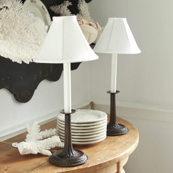 Just so classic! The classical motif of the metal base is one that can work into any interior. The white candle sleeves lead the eye to the simple bell-shaped silk shades. This pair is perfect for a sideboard or chest of drawers. The on/off switches are located on the lamp cords.