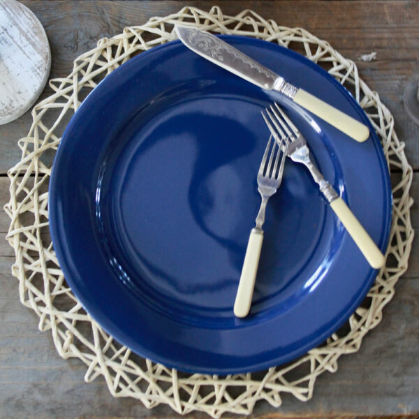 Pop place settings. I love adding chargers under the dinner plates when setting a table. These chargers have the most beautiful rich blue color that add a great foundation for each place setting. This vintage set is from West Germany.