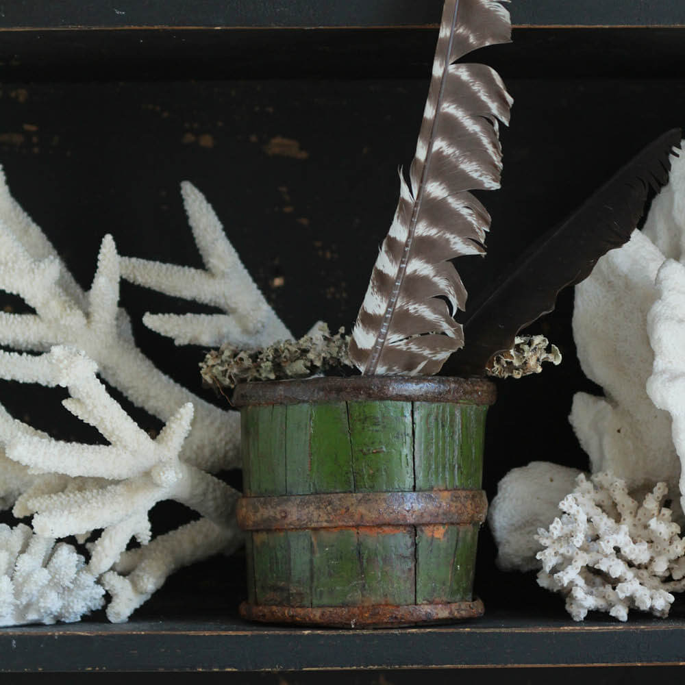 A little gem. Such a fabulous old little barrel bucket painted a rich Forest Green on the outside, left natural on the inside, and banded by old iron rings. Add a collection of feathers, or a small mason jar and show off a bunch of flowers!