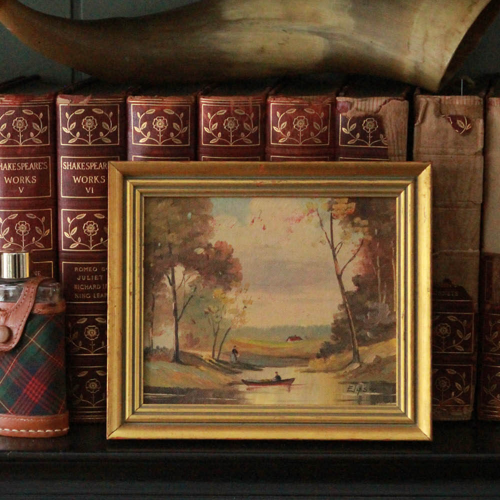 Subtle countryside charm. This charming vintage miniature oil painting depicting a tranquil autumn countryside scene is rendered in soft, brushwork with a warm, romantic palette of ochre, moss green, and muted rose tones. Signed “Elyse” in the lower right corner, this sweet piece is especially versatile — perfect for layering in a bookshelf vignette, styling atop a writing desk, or incorporating into a gallery wall.