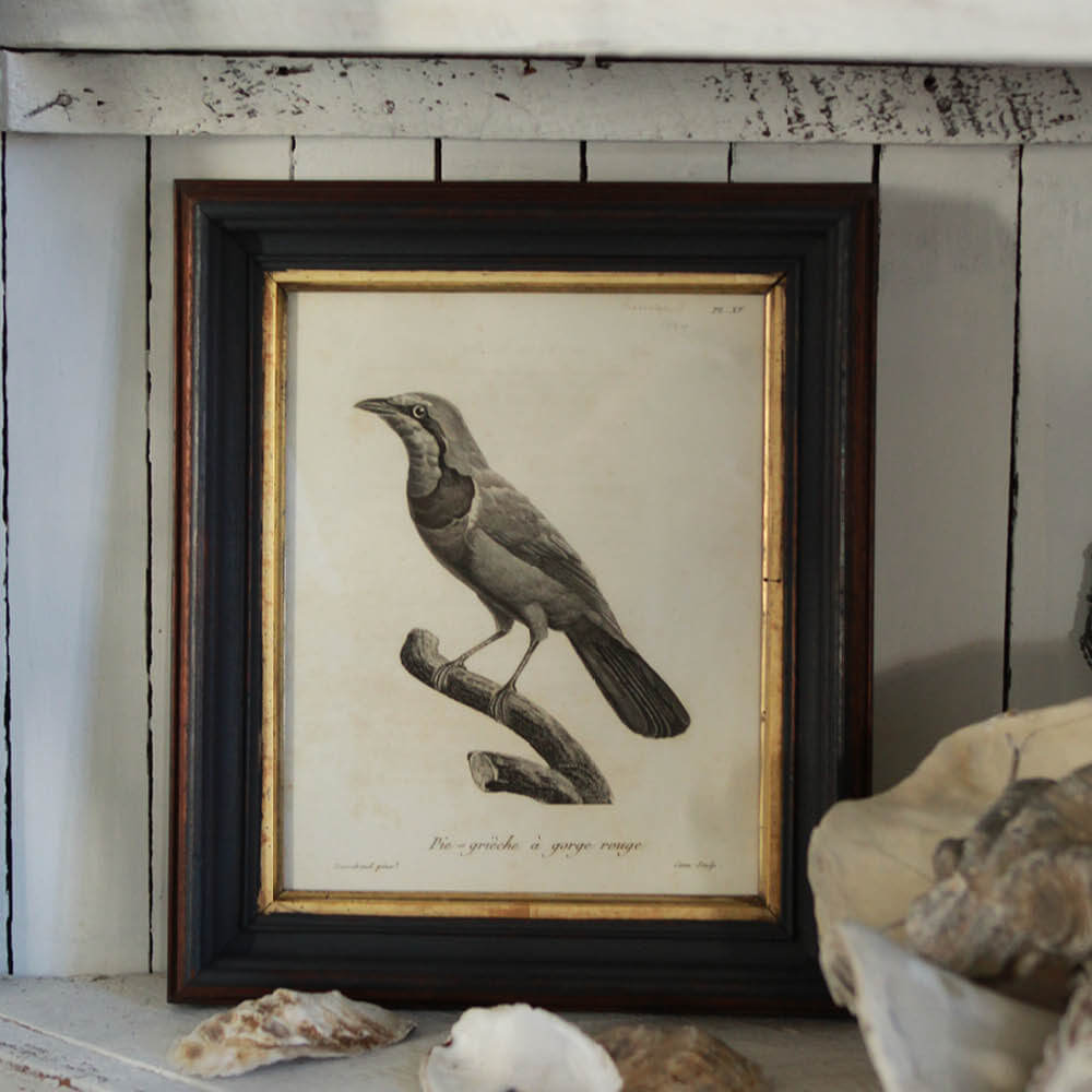 Notable. I found this stunning black and white engraving of a Shrike that was engraved in 1804. I was taken by the striking contrast of the bird’s drawing that is so graphic against the Creamy White paper ground. I found a handsome antique wood frame with a gilded filet that truly “pops” the image.