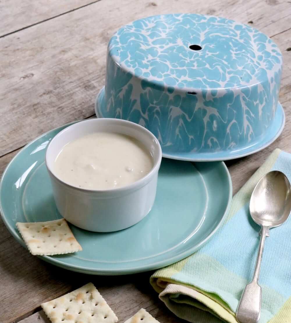 I love the blue coloration of this most unusual vintage splatter ware piece. I don’t know for sure if it was intended to be a cloche to keep hot foods steamy…but it works! Perfect for serving breakfast in bed!