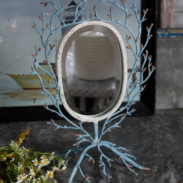 A unique look. This faux coral mirror on stand is crafted of iron and has a textural painted finish. The mirror sports a lovely bevel that adds a luxe character to it. Such an extraordinary find! (Free shipping!)