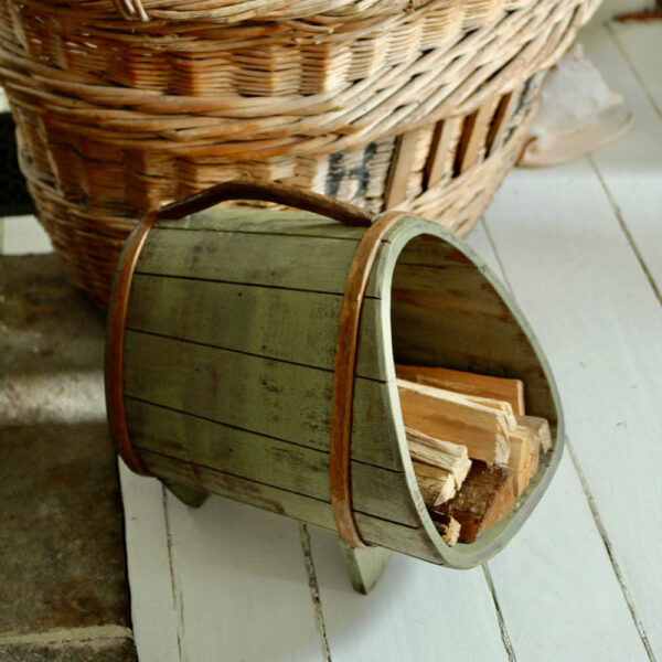 To have and to hold. This fabulous find is truly a one of a kind! The Sherwood Kindling Barrel Caddy is crafted of wood – completely. It is absolutely perfect for stylishly holding kindling next to the fireplace. It is quite a sturdy piece with a hand painted soft Mossy Green color. Love.