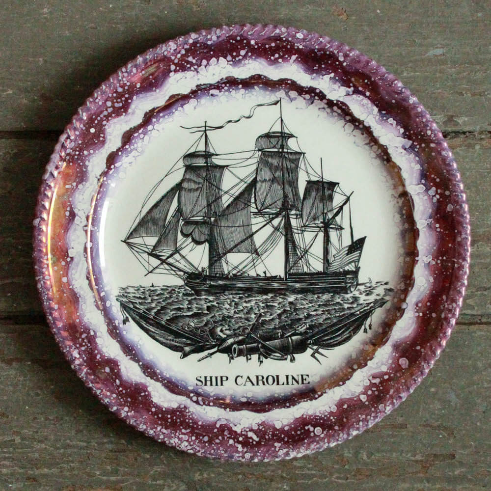 A bold visual statement. This striking vintage maritime commemorative plate features the historic vessel Ship Caroline, rendered in dramatic black transferware against a creamy white ground. The finely detailed engraving captures the full-rigged sailing ship at sea — a timeless tribute to 19th-century nautical craftsmanship. The plate is framed by a richly marbled border in layered tones of burgundy, plum, lavender, and cream with organic speckled detailing. Add a wire plate hanger to hang solo or in a wall grouping.