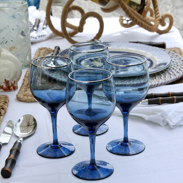Coastal Blue. Pop your table setting with this set of 4 vintage glasses that are the prettiest blue. A fine platinum band encircles the rim and adds just a touch of elegance. They were made by Lenox in the 1970’s- 1980’s and are discontinued.