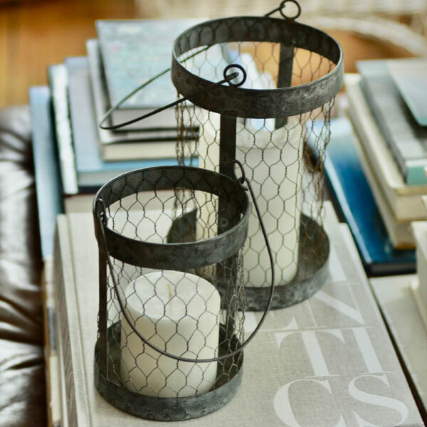 Tranquil evenings. I love candlelight all year round. But for the summer I love to find unique vessels to light candles in. This pair is graduated in size and work so beautifully together. Crafted of galvanized metal and chicken wire, I love the rustic vibe of these two. The larger one can house a 3.5”W pillar, and the smaller a 3”W piller. Each has metal handles that are hinged on loops.