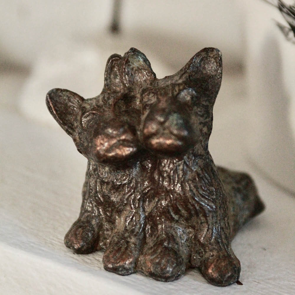 A sweet pair. This charming vintage Scottie dogs figurine captures the beloved Scottish Terrier in a seated pose with wonderful texture and character. Crafted from heavy cast metal, it features a rich dark patina with subtle bronze and copper undertones that highlight the sculpted fur and expressive face.