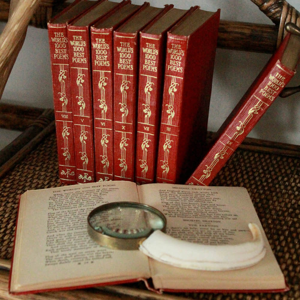 Literary charm. This elegant vintage eight-volume set of The World’s One Thousand Best Poems, edited by Berton Braley and published by Funk & Wagnalls. Bound in rich red leatherette with gilt lettering and decorative spine detailing, these compact volumes create a refined and cohesive visual statement when displayed together and evoke a classic English library aesthetic, making them ideal for shelf styling, coffee table stacks, or study décor.