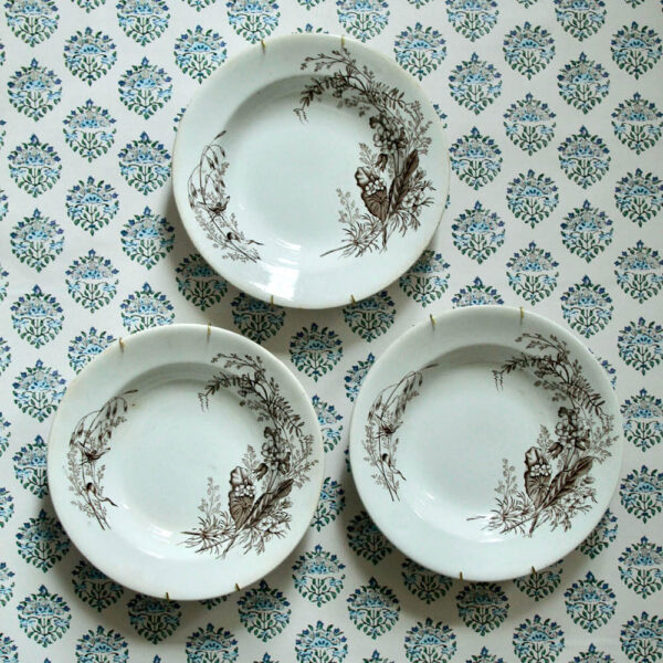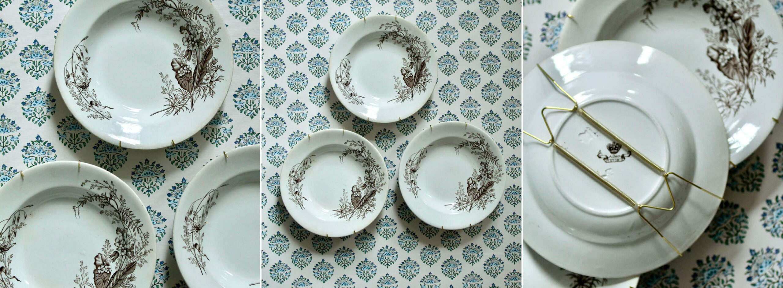 Fresh romanticism. I have always loved adding a variety of artful solutions to my walls – one favorite is hanging a collection of plates and bowls. This set of Dark Chocolate Floral on Cream transferware bowls have the prettiest motifs! A cluster of wildflowers on the right, and smaller sprigs complete with a bee on the left. I’ve added brass plate holders for easy hanging.