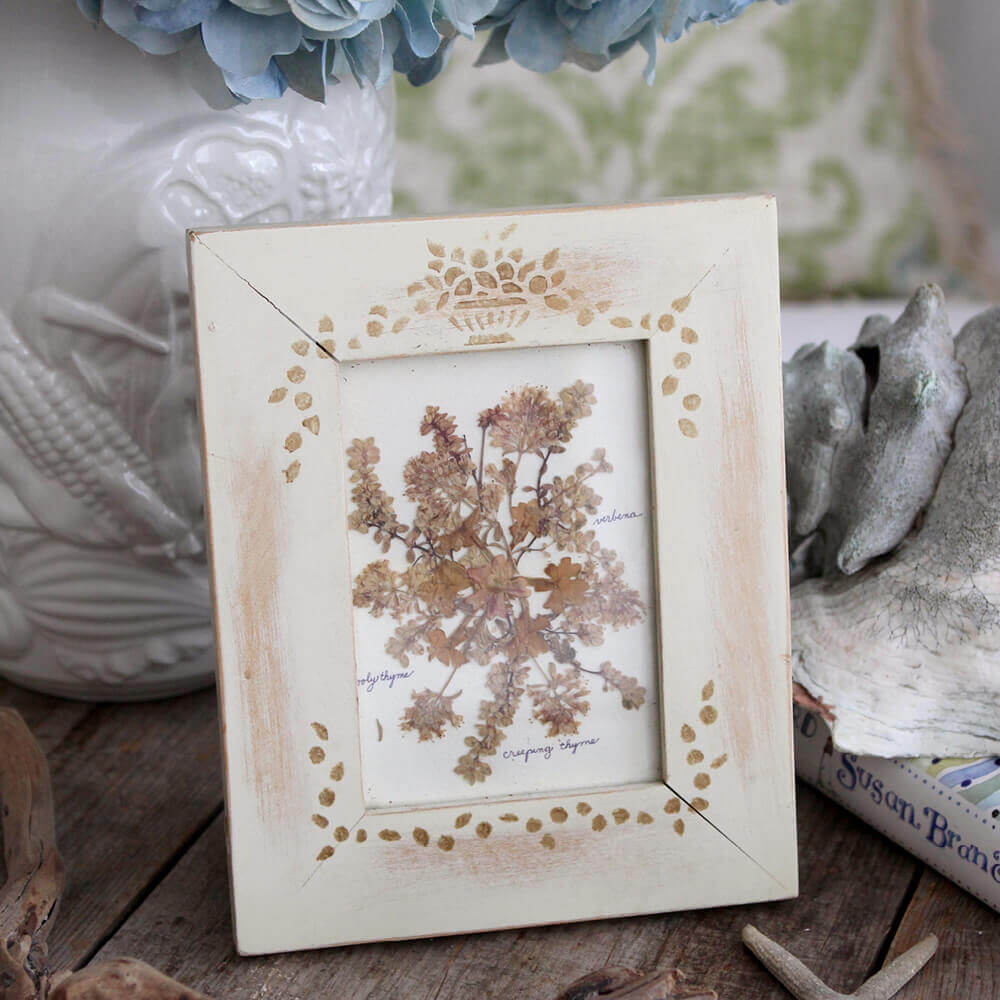 Pressed herbs/flowers, glass, stenciled frame with easel back