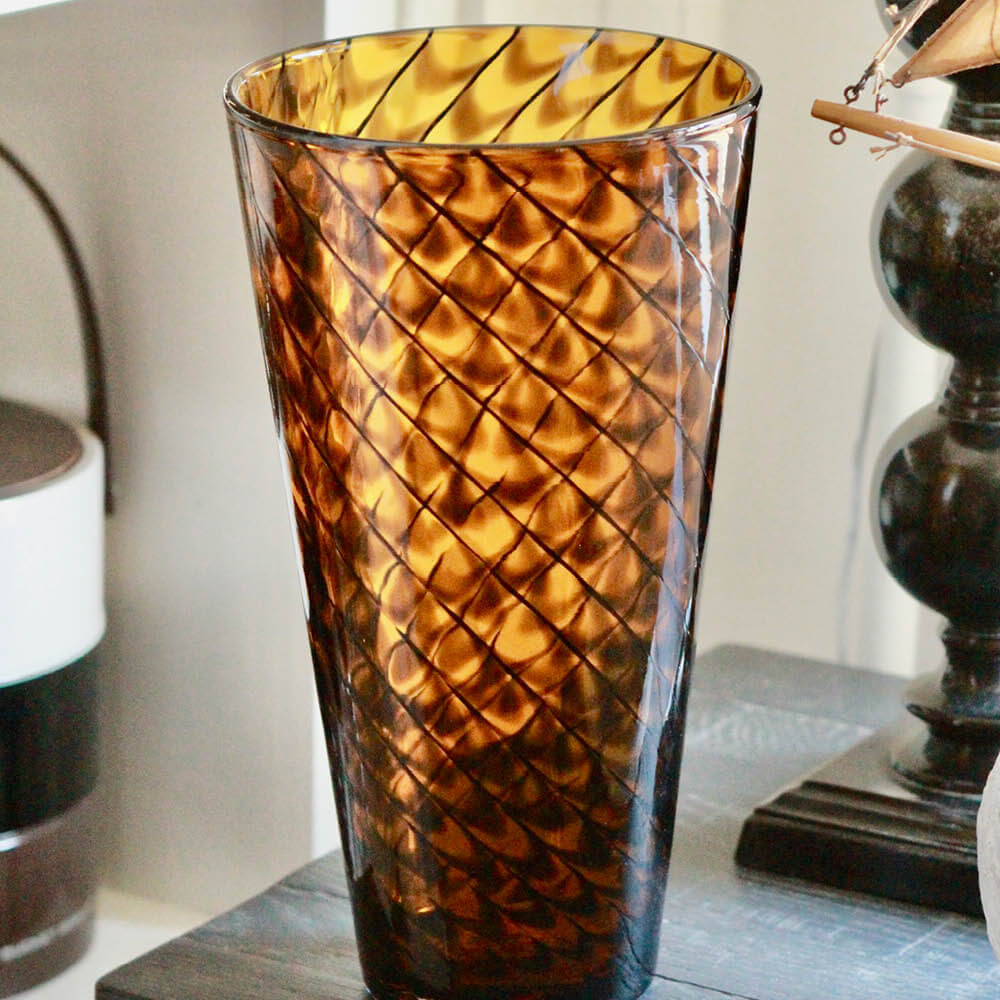 Oh that glow! This striking vintage amber glass piece features a dramatic hand-blown swirl pattern that wraps the entire body, creating depth, movement, and rich golden glow when light passes through. The interior displays a molten honey tone, while the exterior shows darker amber and brown feathered waves, giving this piece strong mid-century modern appeal. The thick base and visible pontil swirl indicate a craftsman’s workmanship.