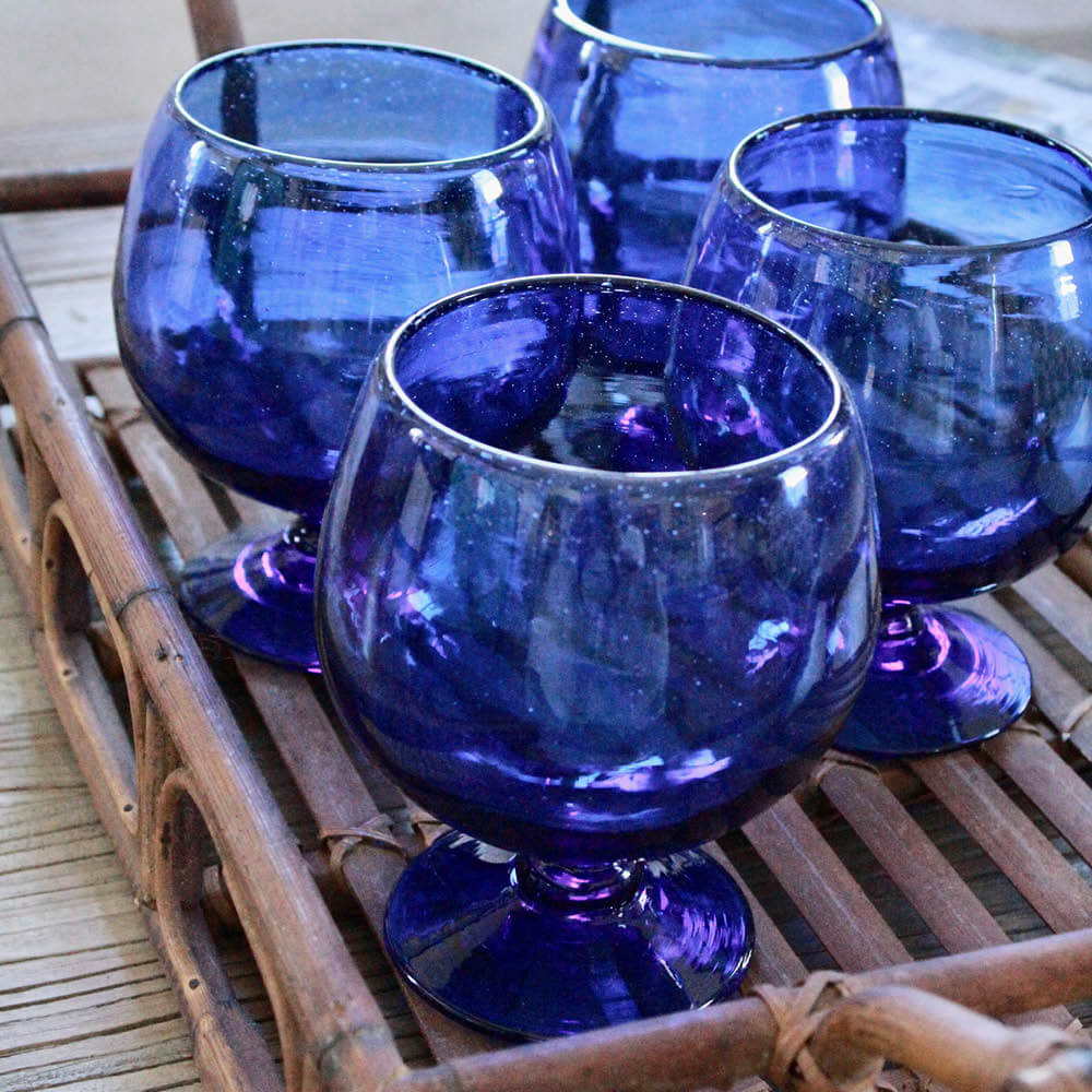 Mid-century inspired entertaining.This striking set of four vintage cobalt blue brandy snifter glasses features rounded balloon bowls and short pedestal stems. The rich sapphire blue glass creates a beautiful jewel-like effect that catches the light and adds depth to any bar or table setting. The classic snifter shape is ideal for brandy, port, after-dinner cocktails, or even desserts like trifles and ice cream!
