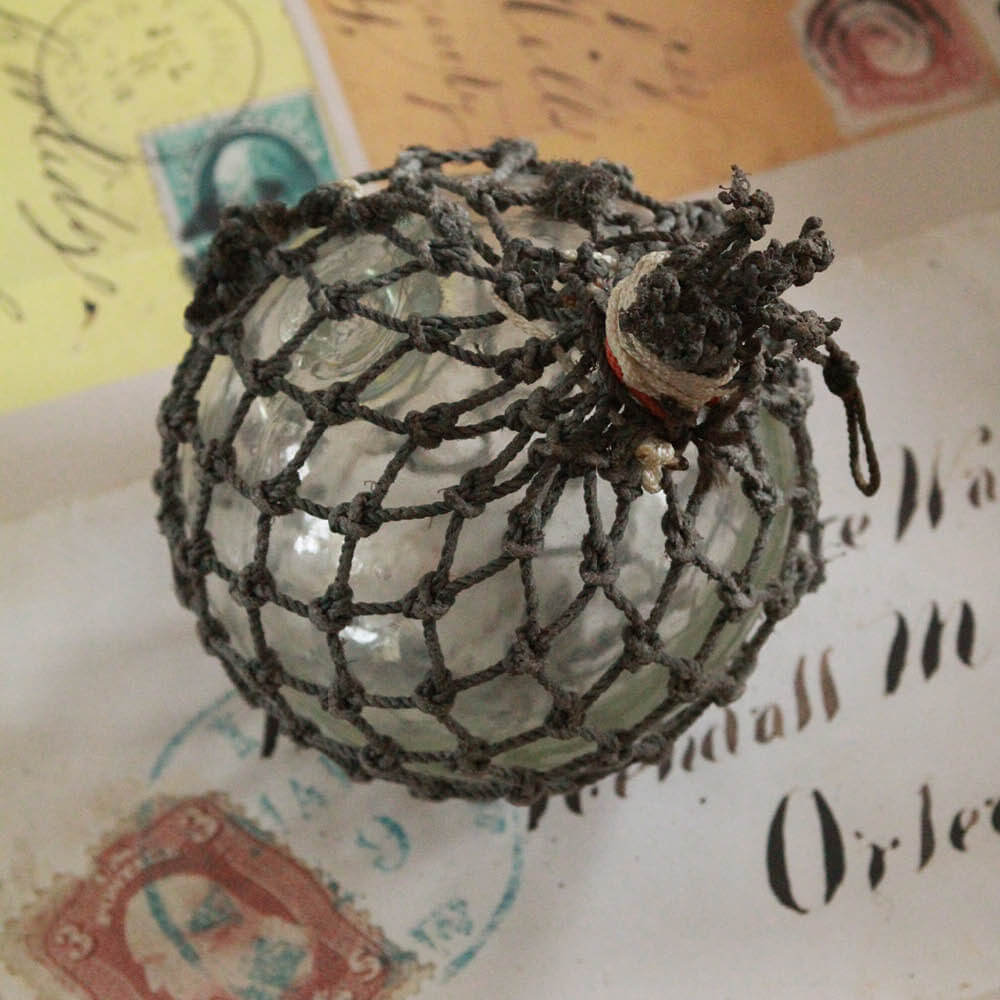 Clear blown glass sphere, pontil seal, hand-tied rope net