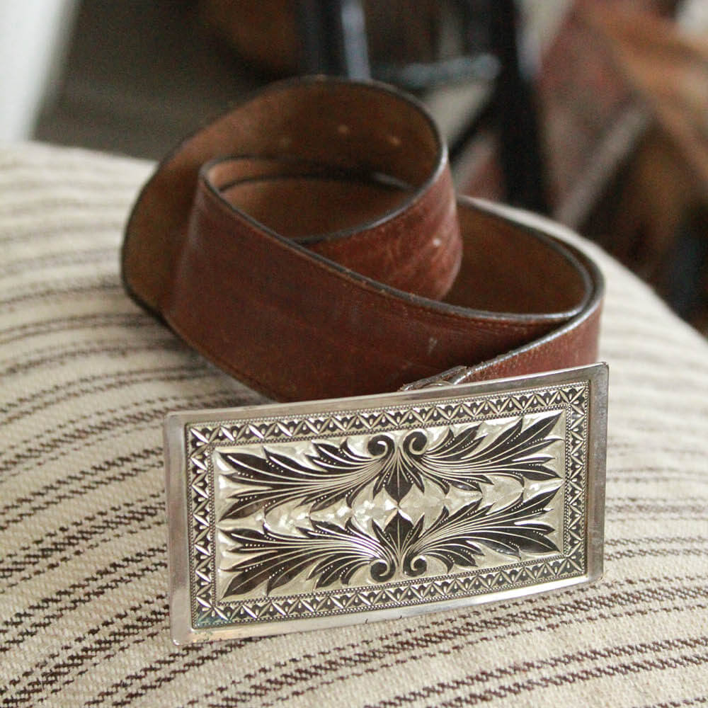 Thick brown leather strap, hand-engraved silverplate rectangular buckle