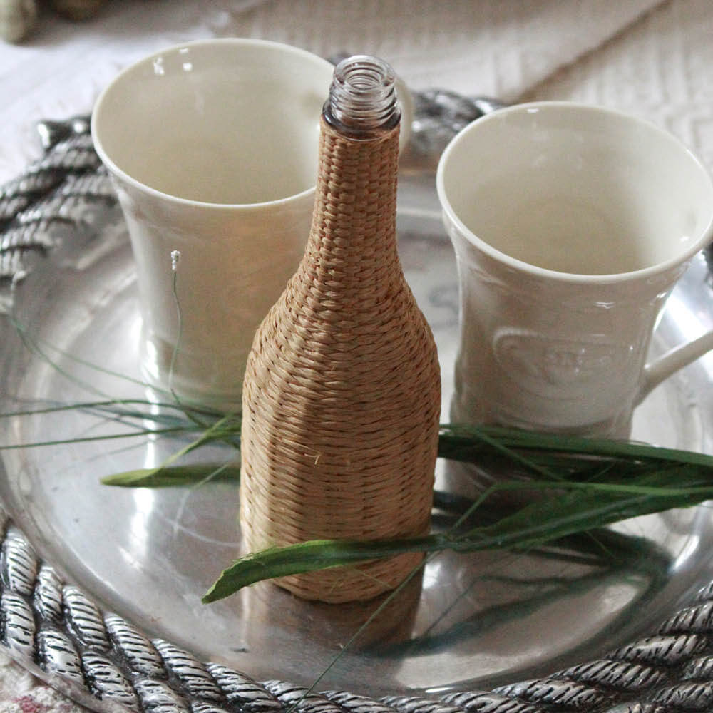 Woven natural rattan encased glass bottle