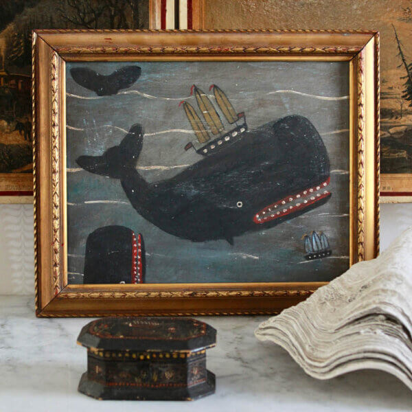 Whimsy at its best. A favorite artist of mine with a new series of whale paintings. This original by Melinda Kirkpatrick is painted on board and custom framed.