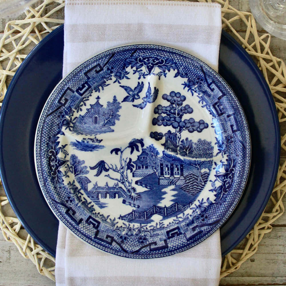 A classic. Inky blue at its best! I’ve been collecting Ironstone Willow Ware plates for years! They are so striking, especially when they’re set off by a textural placemat or charger. Each plate is divided into 3 sections, and can be used for all meals – inside or outside.