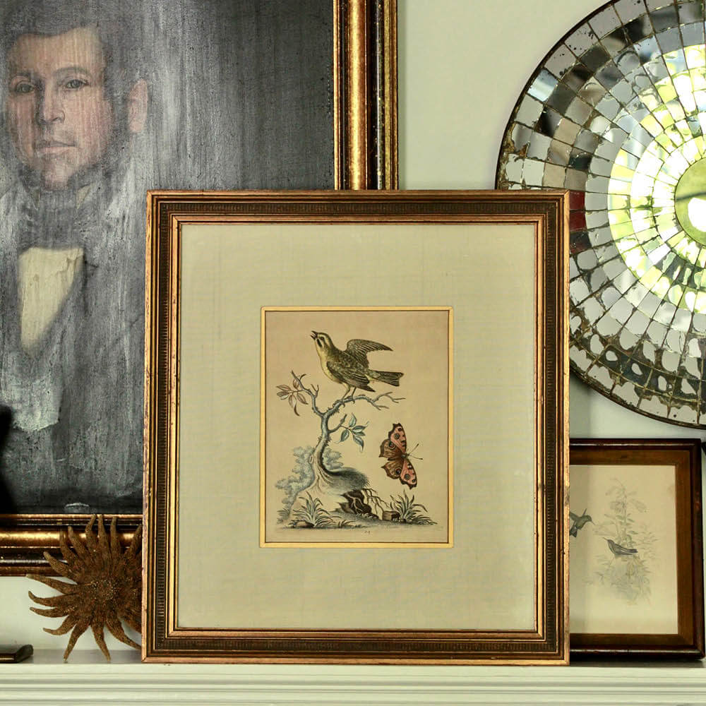 Classic beauty. I found this stunning 18th c. engraving by George Edwards in South Carolina. The subjects: Yellow Breasted Green Finch, Butterfly and botanical are just so beautifully rendered and charming! This piece was professionally framed by Coffey & Thompson, North Carolina and is double matted in a silk mat with a gold filet and classic wood frame finished in an antique gold. A rare find.