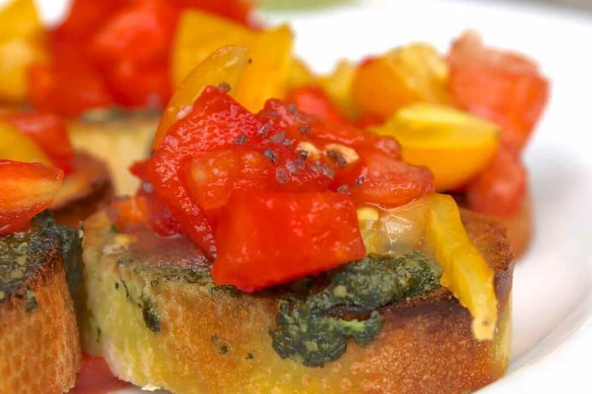 Quickly, before the bread cools too much, spoon a tablespoon or so of the tomatoes onto each slice.Sprinkle a pinch of sea salt on each (we used smoked sea salt).